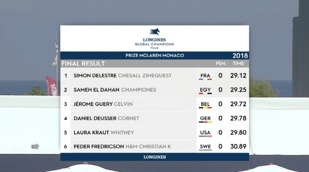 Alla fine, la vittoria è andata a Simon Delestre con Chesall Zimequest (0/0-29.12″) seguito da Sameh El Dahan con Championes (0/0-29.25″) e Jérome Guery con Celvin (0/0-29.72″).
